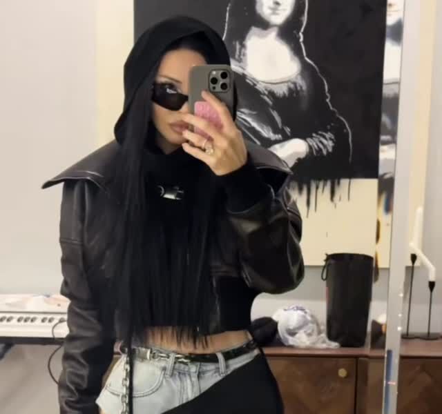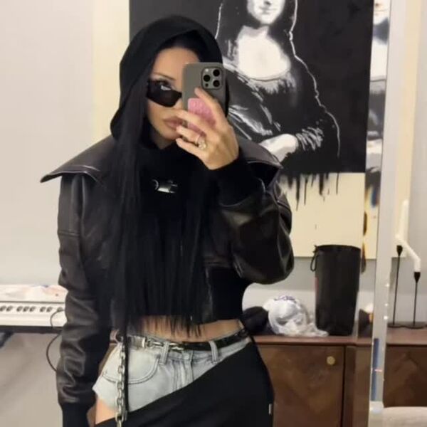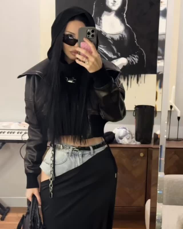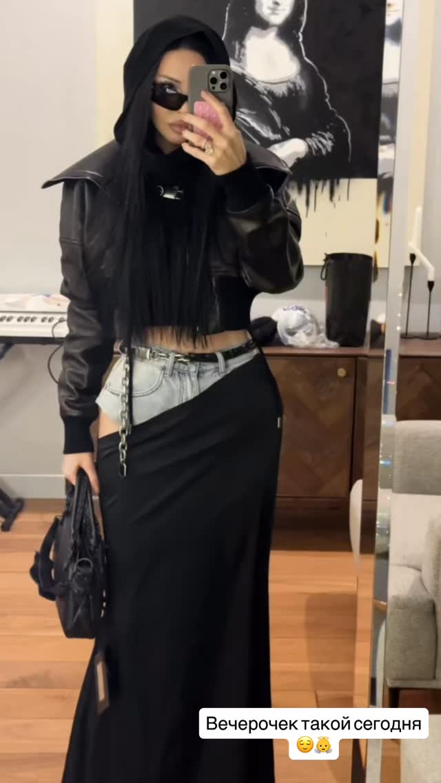 Оксана Самойлова вышла на публику в черной спущенной юбке с разрезом и джинсовой вставкой, кожаной куртке и топе. Образ дополнили очки и сумка из кожи.
