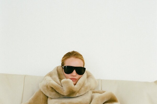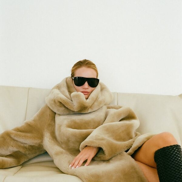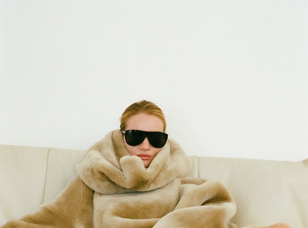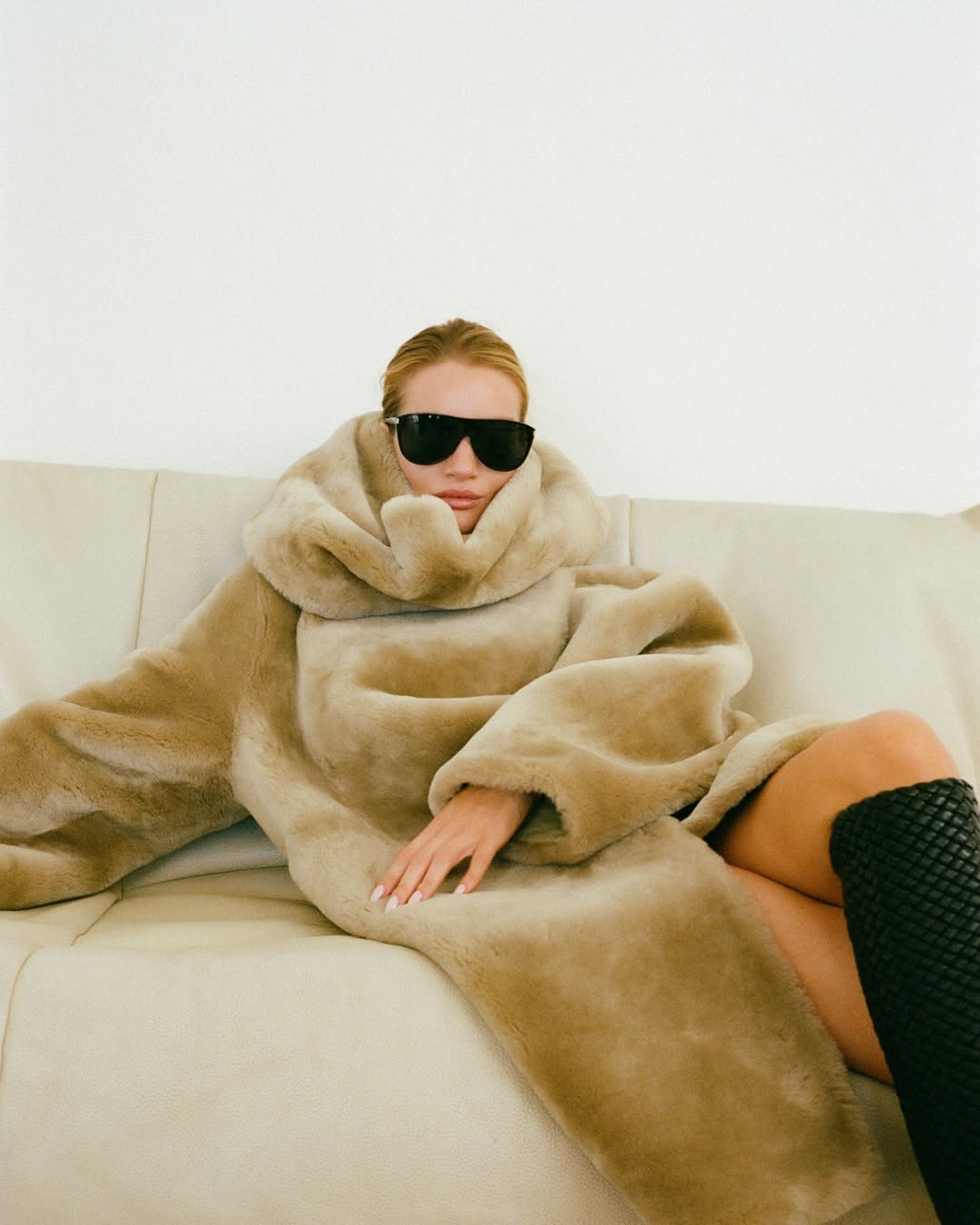 Модель Рози Хантингтон-Уайтли снялась в бежевой шубе на голое тело. Образ дополнили очки и сапоги из плетенной кожи. Волосы ей собрали в пучок и сделали легкий макияж.