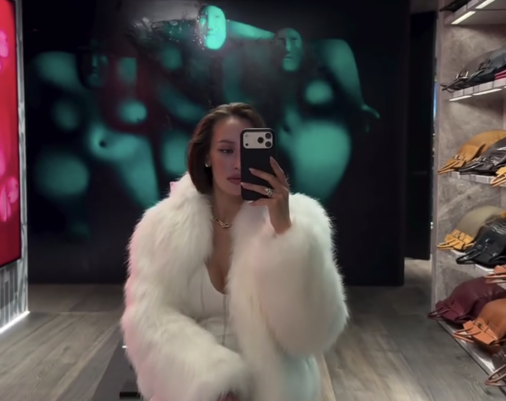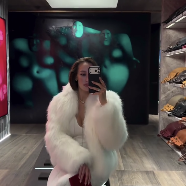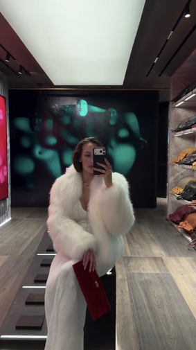 Валентина Иванова предстала перед камерой в белом облегающем платье, которое дополнила укороченной шубой в тон, массивной цепью и бордовой сумкой.