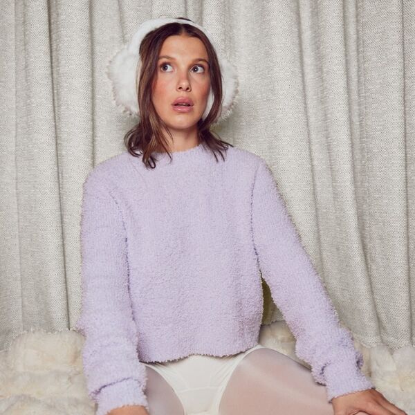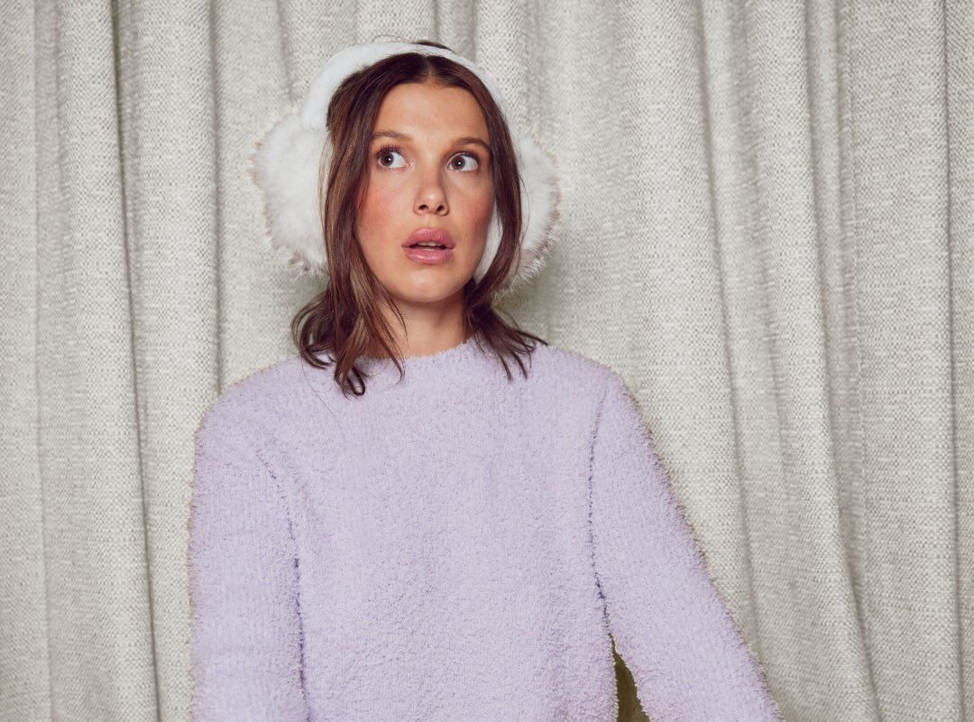21-летняя Милли Бобби Браун предстала перед камерой в лавандовом пушистом свитере, который сочетала с белыми микрошортами, колготками в тон и меховыми наушниками. Актриса позировала с распущенными волосами и макияжем в естественном стиле с тушью, румянами и розовой помадой.