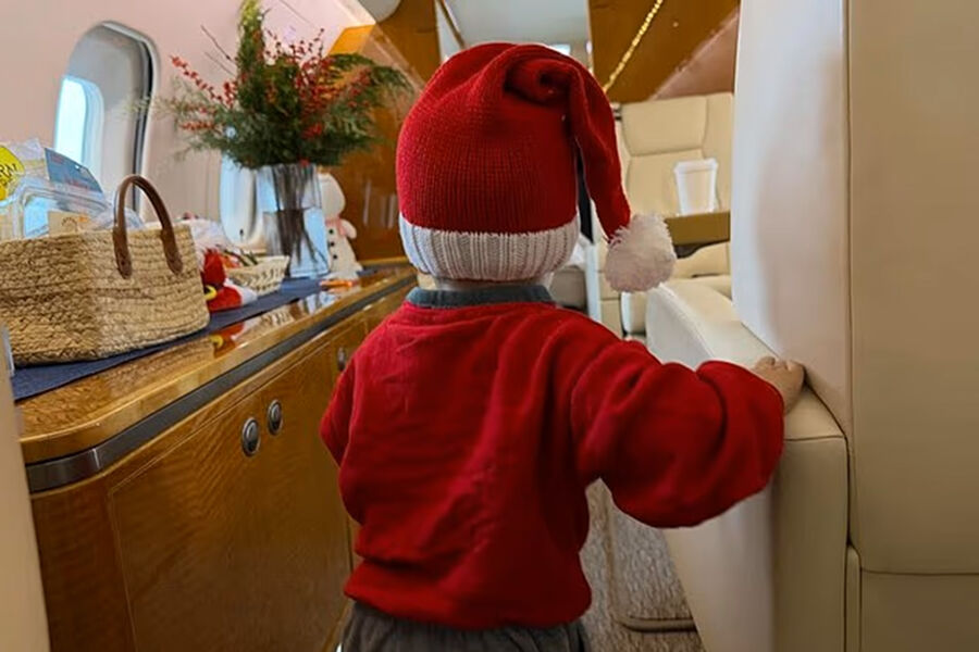 Годовалый Джек Блюз был запечатлен в вязаной шапочке Санты, красном свитере и серых брюках. Сын певца и модели стоял спиной к камере и смотрел на салон частного самолета. Внутри джет был украшен миниатюрным снеговиком, декорациями в виде Санта-Клауса и зимнем букетом красно-зеленых цветов.