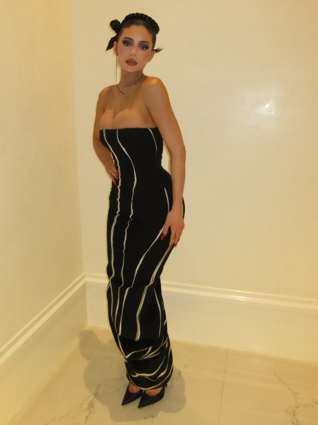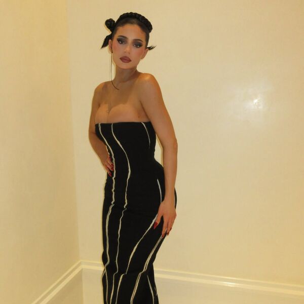 Кайли Дженнер показала кадры, сделанные во время празднования католического Рождества. Для мероприятия модель выбрала винтажное облегающее макси-платье от Джонна Гальяно с драпировкой снизу. Бизнесвумен добавила к образу туфли на каблуках в тон. Звезде реалити-шоу сделали укладку с косами и макияж с темными тенями, контурингом, румянами и матовой темно-розовой помадой.