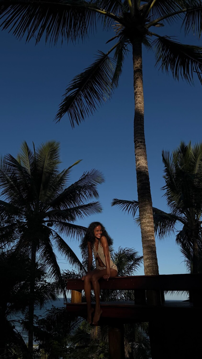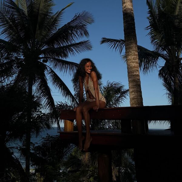 29-летняя Нара Баптиста позировала перед камерой в бежевом комплекте, который состоял из топа с глубоким декольте и коротких шортов. Модель предстала в кадре с распущенными волосами и без косметики. Манекенщица сидела на фоне пальм и океана.
