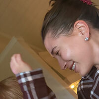 Хейли Бибер позировала в клетчатой пижаме. Волосы модель собрала в пучок и сделала легкий макияж. В кадре она держала ребенка на руках.