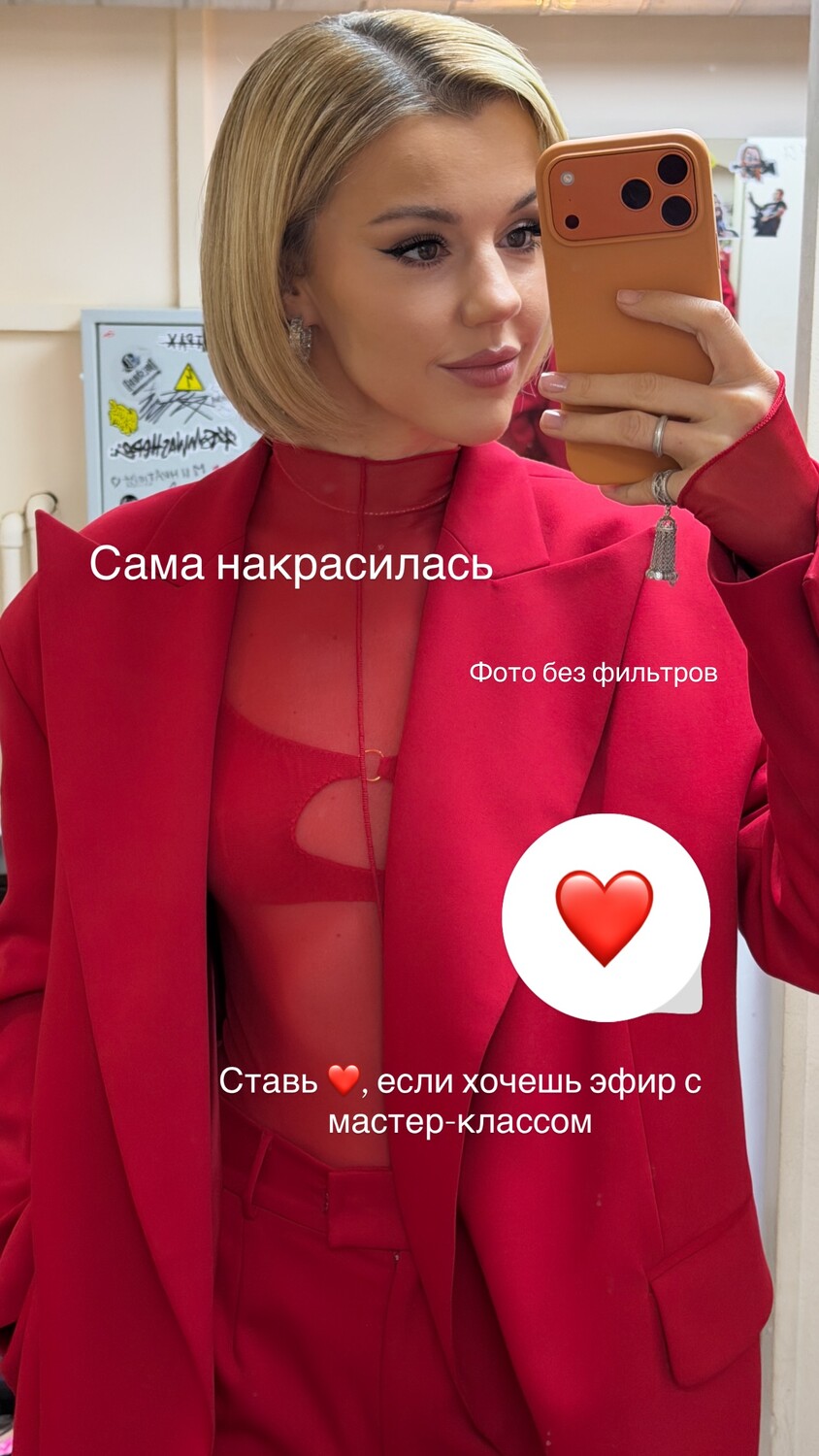 Юлианна Караулова позировала в прозрачном красном топе, брюках и жакете. Волосы ей выпрямили и сделали вечерний макияж о стрелками.