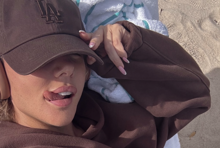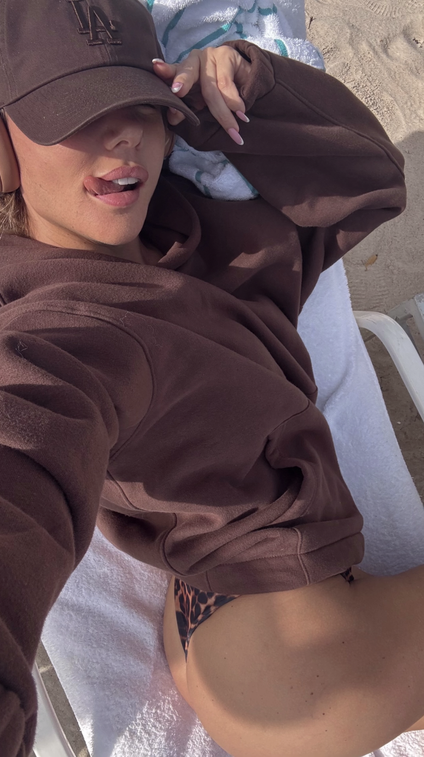 Анна Седокова предстала перед камерой в леопардовом слитном купальнике, который дополнила шоколадным худи и кепкой в тон. Поп-исполнительница убрала волосы под головной убор. Певица в наушниках лежала в шезлонге.
