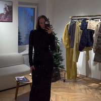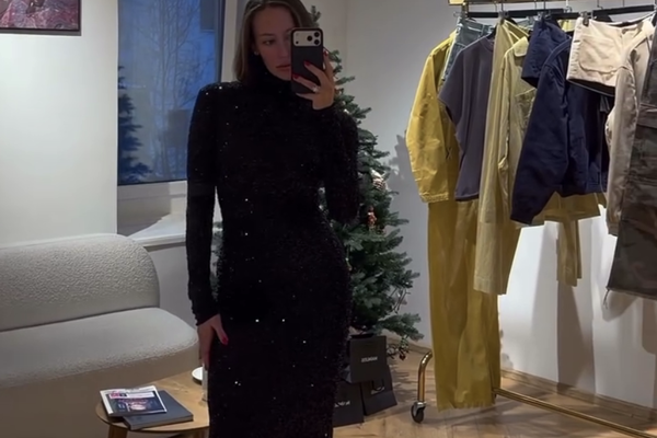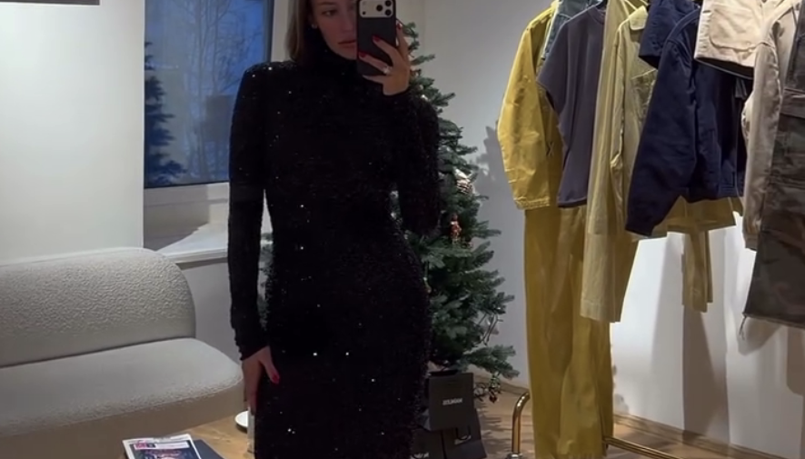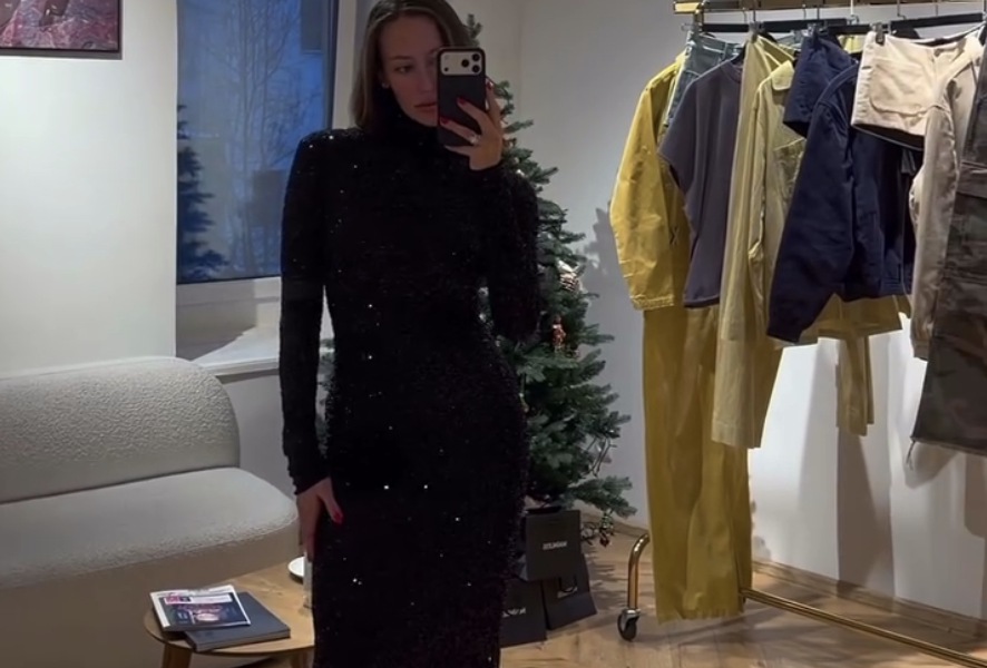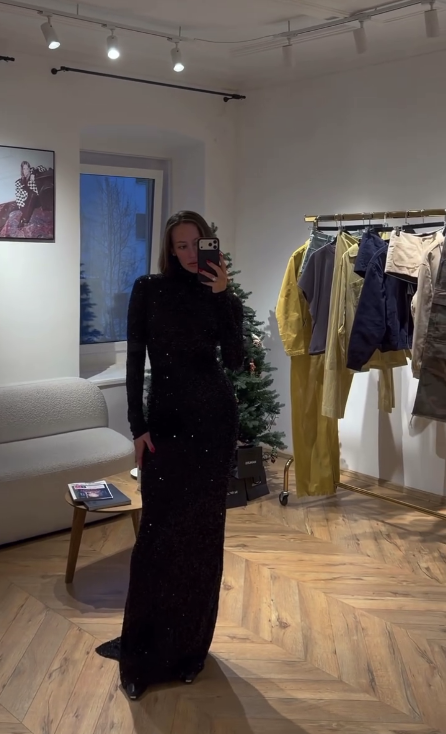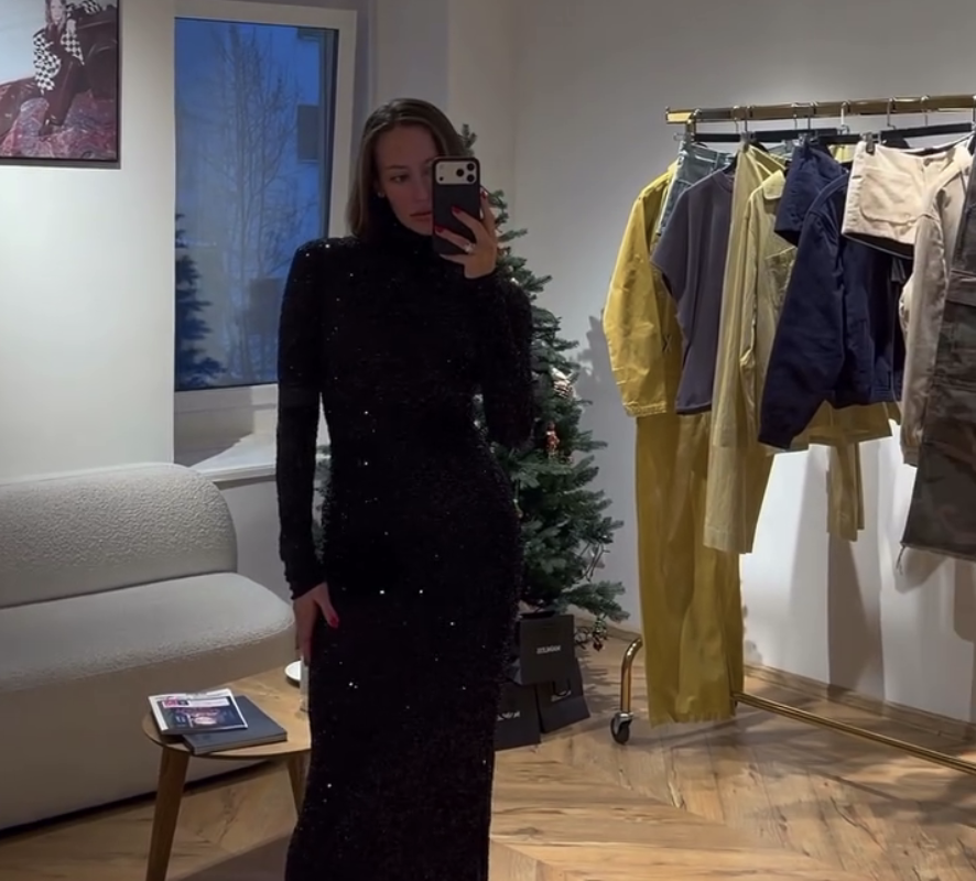 Валентина Иванова стояла перед зеркалом в черном облегающем макси-платье, которое было полностью украшено пайетками. Девушка Тимати была запечатлена с уложенными распущенными волосами и макияжем в нюдовых тонах на фоне елки.