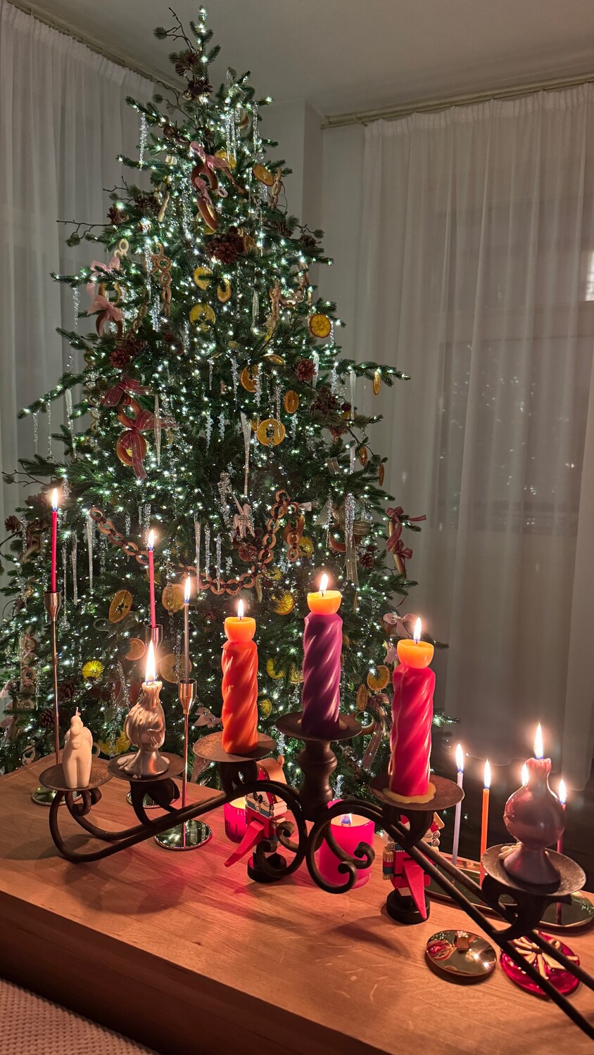 Ида Галич показала интерьер панорамной квартиры с новогодней елкой с советскими игрушками и дождиком. Бизнесвумен также поставила на комод набор свечей разной формы и цветов.
