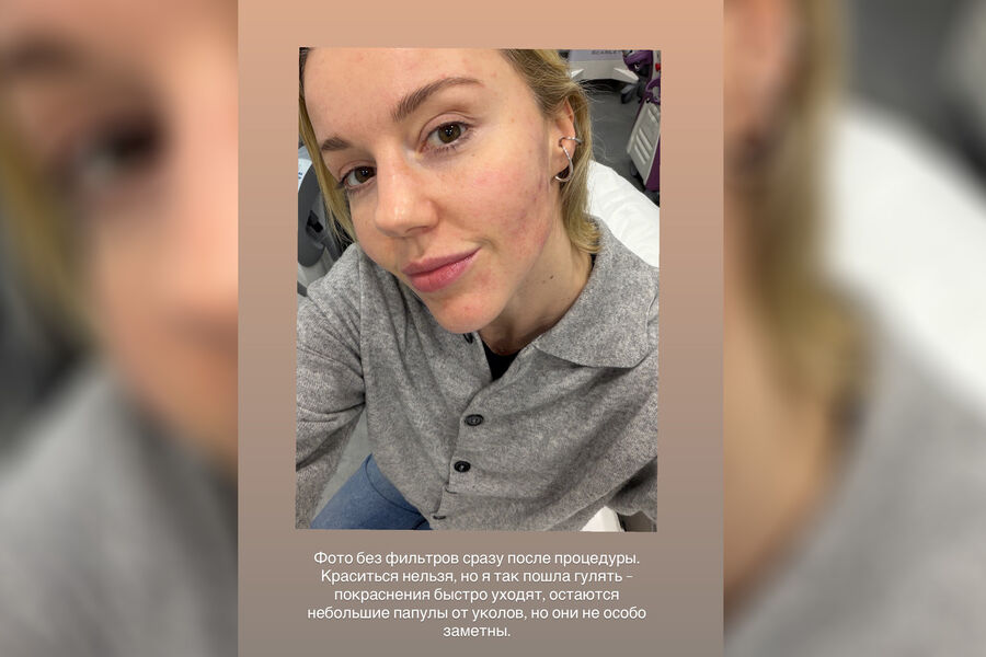 «Фото без фильтров сразу после процедуры. Краситься нельзя, но я так пошла гулять — покраснения быстро уходят, остаются небольшие папулы от уколов, но они не особо заметны», — написала Караулова.