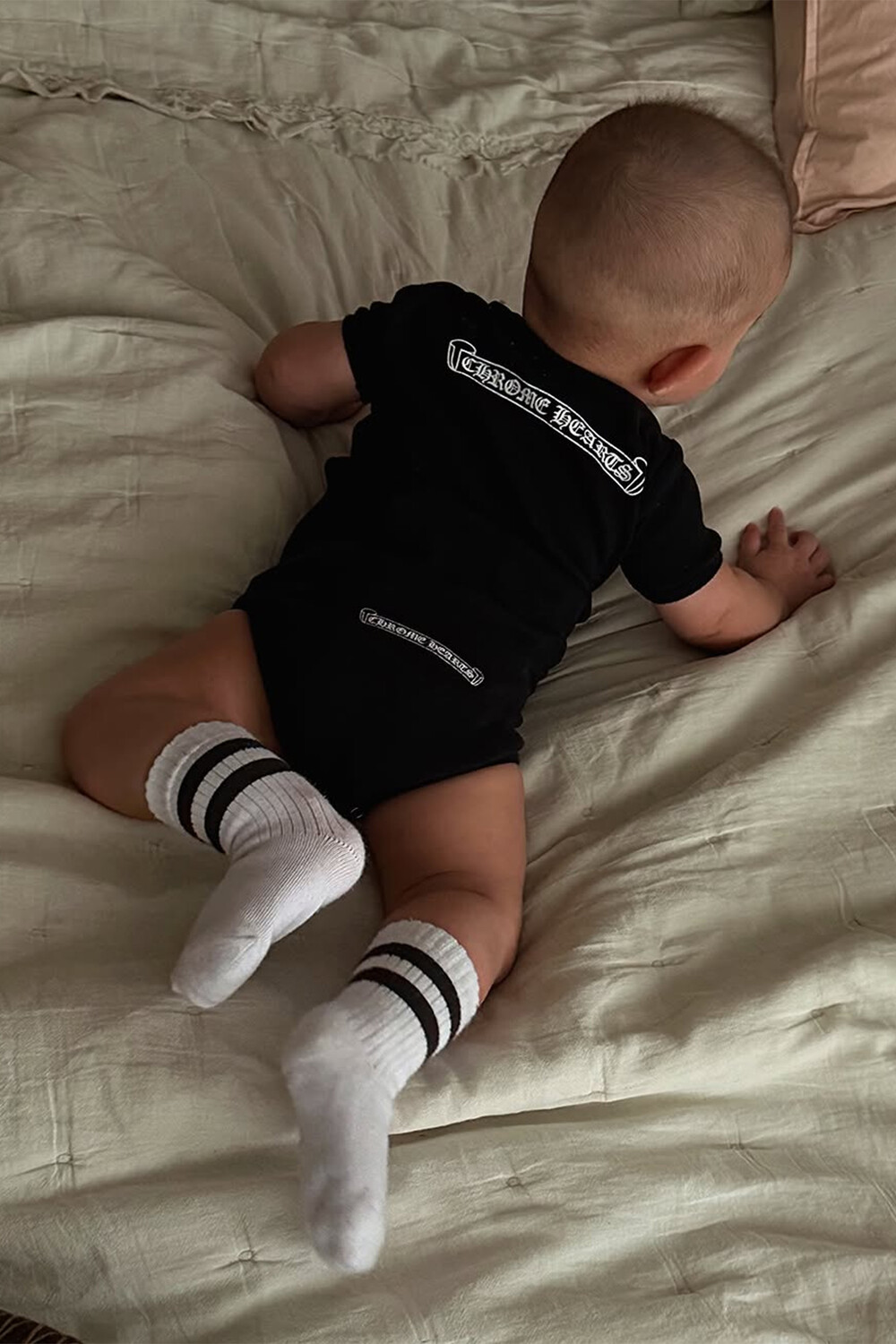 Девочка лежала на животе в черном боди Chrome Hearts и белых носках с полосками. Дочь Тимати и Валентины Ивановой была повернута к камере спиной. Знаменитости пока не показывают лицо ребенка.