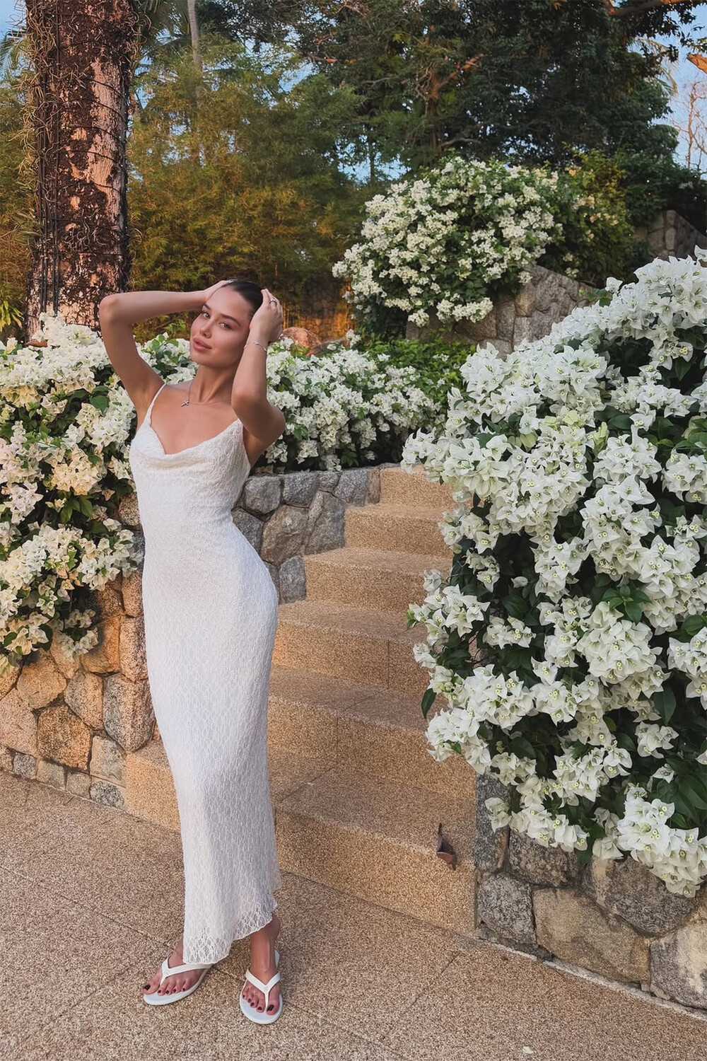 19-летняя Аврора Киба предстала перед камерой в белом кружевном макси-платье с глубоким декольте, которое дополнила вьетнамками в тон, кольцом и браслетом. Девушка позировала с уложенными волосами и макияжем в естественном стиле на фоне лестницы и цветов.