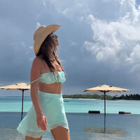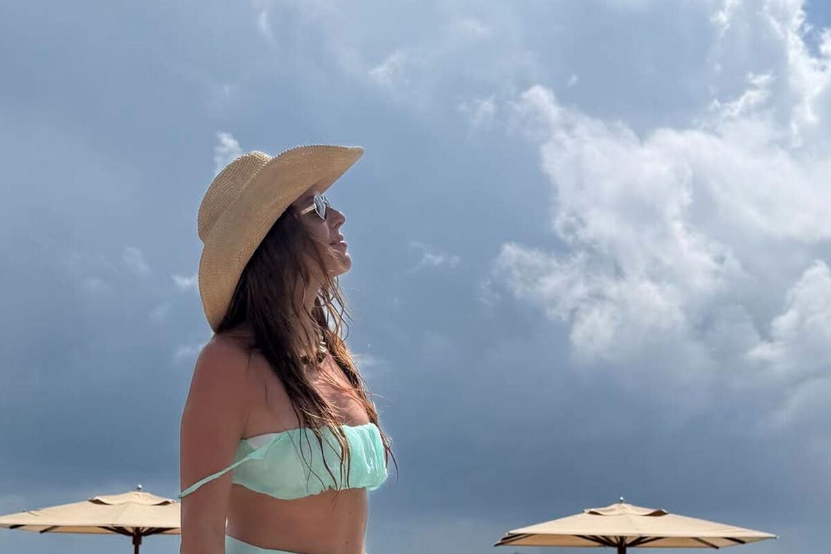 43-летняя Наталья Подольская предстала перед камерой в голубом комплекте, который состоял из топа на тонких бретелях и мини-юбке. Певица добавила к костюму светлую широкую шляпу, солнцезащитные очки и ожерелье. Поп-исполнительница стояла перед фотографом с мокрыми распущенными волосами и без косметики. Кадр был сделан во время отдыха знаменитости на Мальдивах.