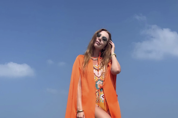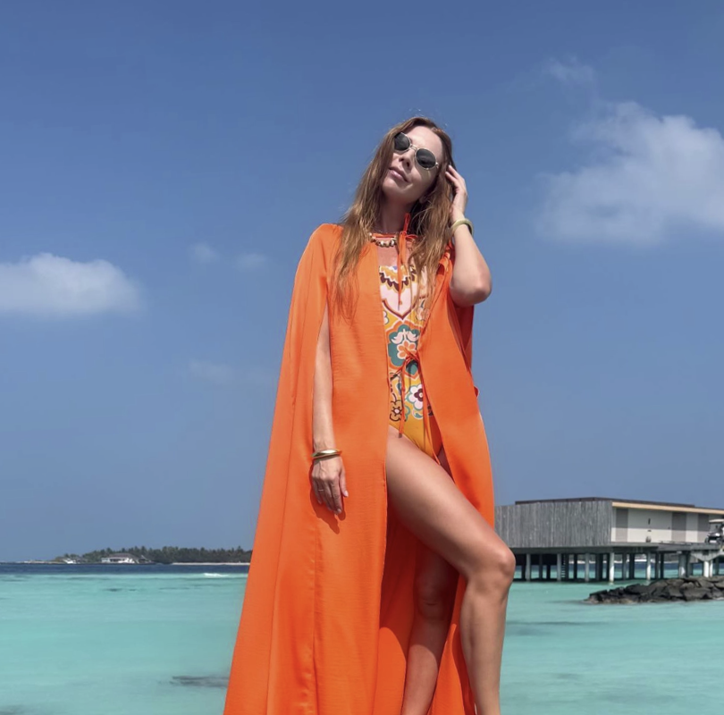 43-летняя Наталья Подольская позировала перед фотографом в оранжевом слитном купальнике с разноцветным узором, который сочетала с длинной накидкой в тон. Певица также надела массивные браслеты, колье и солнцезащитные очки. Поп-исполнительница распустила волосы и отказалась от макияжа. Знаменитость была запечатлена, стоя на камнях на Мальдивах.