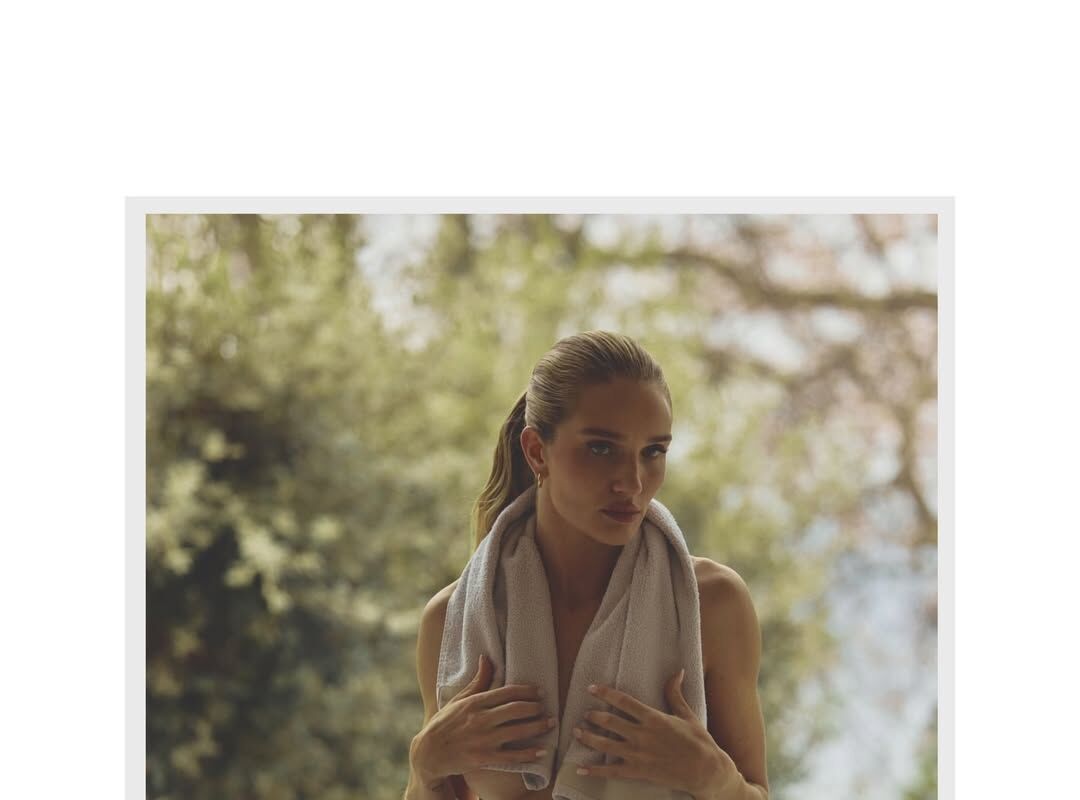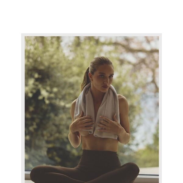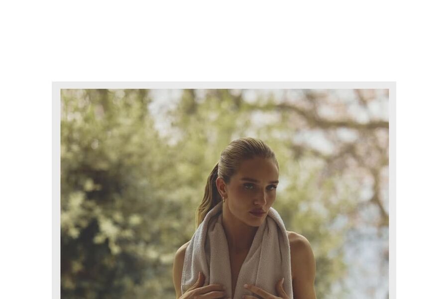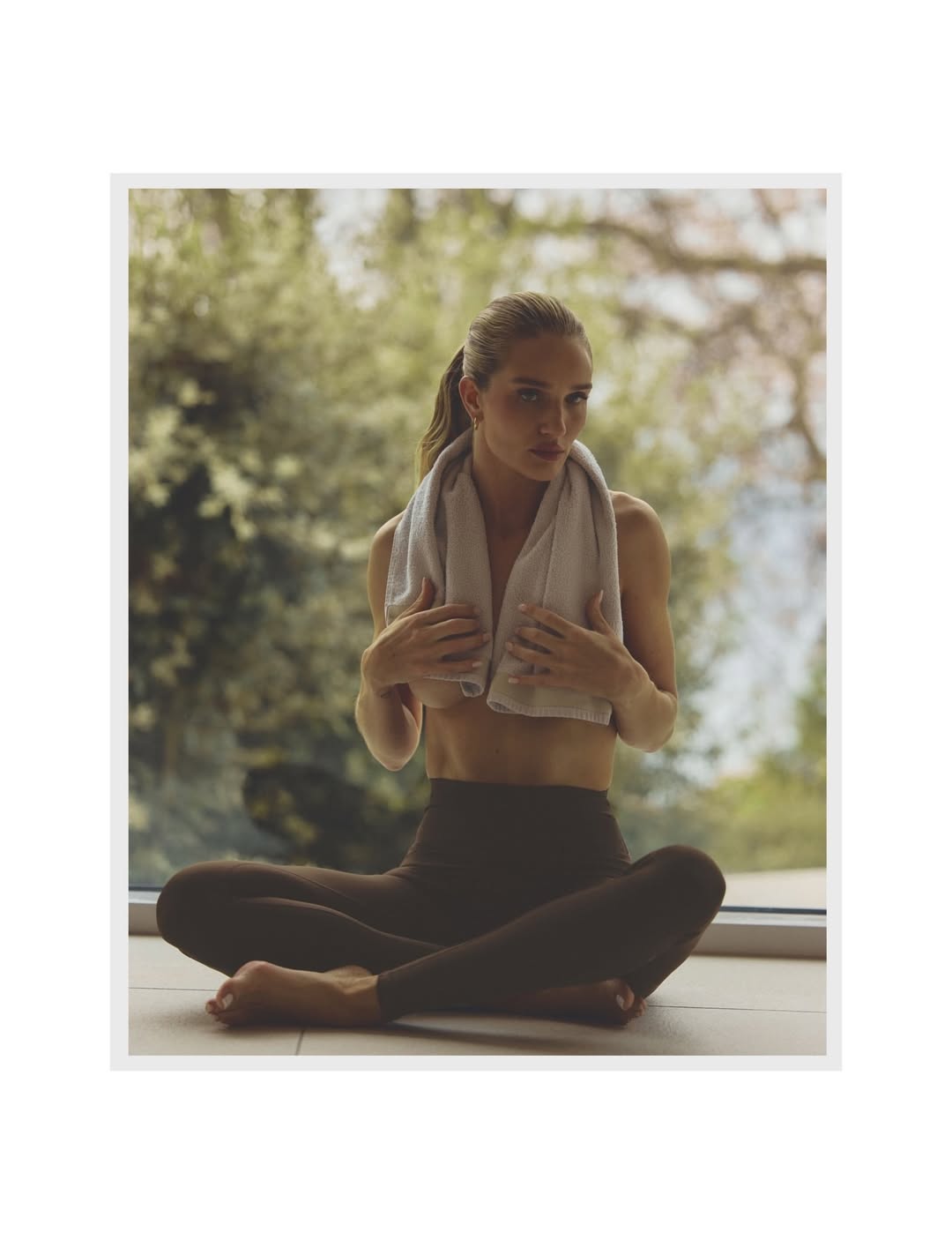 Модель Рози Хантингтон-Уайтли позировала в коричневых легинсах, топлес, прикрыв грудь белым полотенцем. Волосы она собрала в высокий хвост и отказалась от макияжа.