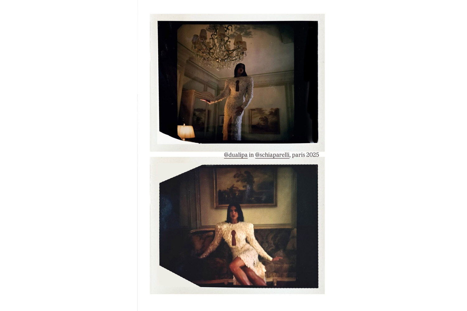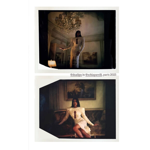 Дуа Липа позировала в платье «невесты» с разрезом до бедра и с декольте в виде замочной скважины. Волосы ей уложили локонами и сделали вечерний макияж.