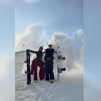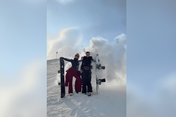 Оксана Самойлова прокатилась на сноуборде с Клавой Кокой в Куршавеле. В кадре они позировали на склоне, пока другие спортсмены окатили их снежной волной.