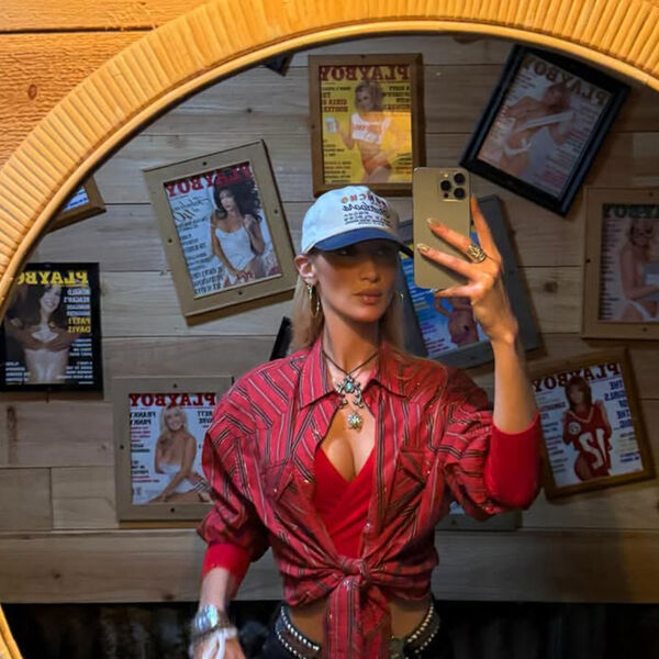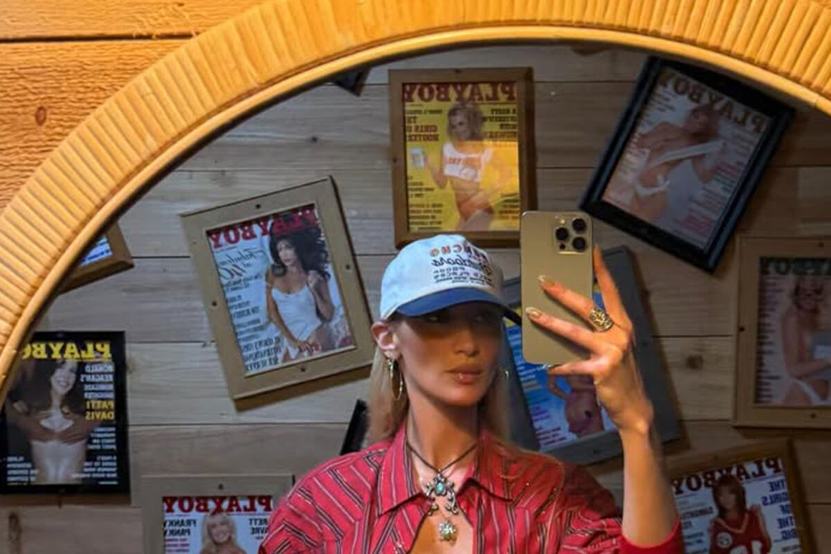 Белла Хадид стояла перед зеркалом в красном облегающем топе с глубоким декольте, который дополнила рубашкой в клетку в тон. Модель также надела синие джинсы с коричневым ремнем, бело-синюю кепку, ожерелье, серьги, кольца и браслеты. Манекенщица позировала с распущенными волосами и макияжем.