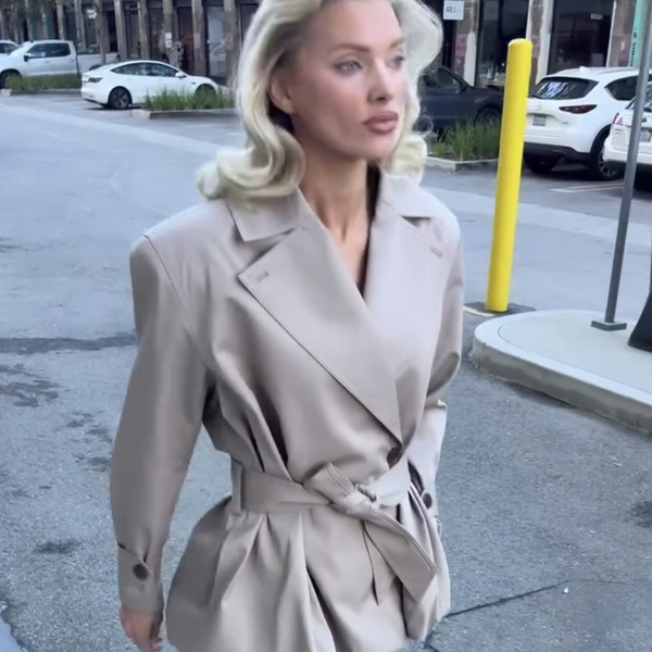 Эльза Хоск позировала в бежевой куртке, голубых чулках и серых туфлях. Волосы ей уложили легкими локонами и сделали дневной макияж с блеском на губах.