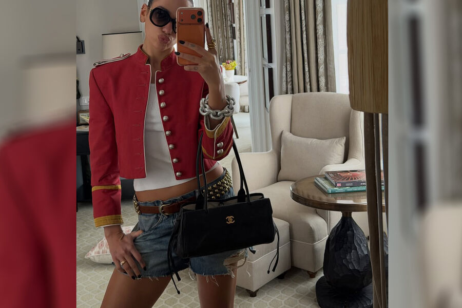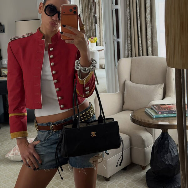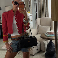 Дуа Липа появилась на публике в синих шортах с рваниной и карманами, белом топе и красном «гусарском» жакете. Образ дополнили очки и сумка Chanel. Волосы певица собрала в пучок и сделала легкий макияж.