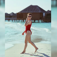 Татьяна Брухунова позировала в красном слитном купальнике с глубоким декольте. Волосы стилистка распустила и отказалась от макияжа. В кадре она заходила в океан, чтобы искупаться.