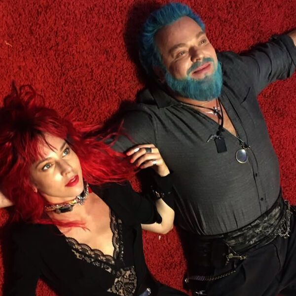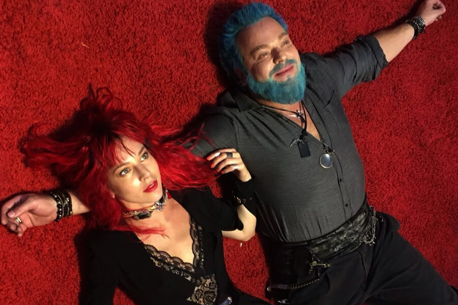 Пара позировала лежа на красном полу в вечерних образах с красными и синими волосами. Владимиру Преснякову также сделали синюю бороду.