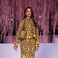 Певица Дуа Липа в пестром костюме с юбкой посетила показ в Париже