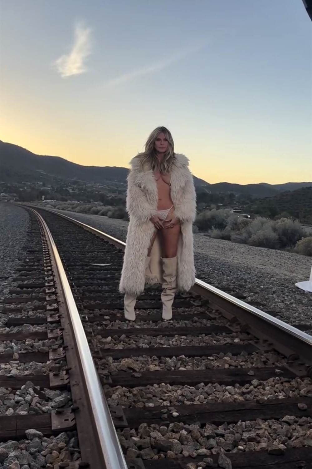 52-летняя Хайди Клум обнаженной с шубой на плечах снялась на железнодорожных путях