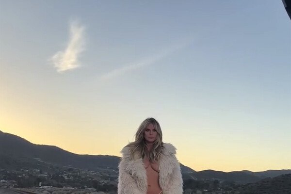 52-летняя Хайди Клум позировала обнаженной с белой шубой на плечах. Волосы ей уложили мягкими прядями и сделали легкий макияж. Съемка проходила на закате на железнодорожных путях.