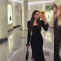 38-летняя Настасья Самбурская стояла перед зеркалом в черном облегающем платье-миди с объемными плечами и кружевом на рукавах. Актриса дополнила образ массивным колье, серьгами и кожаной сумкой. Певица уложила волосы и сделала макияж с черными стрелками.
