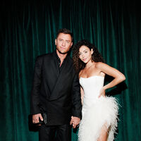 Павел Прилучный позировал в черном костюме и рубашке. Образ дополнили ботинки и сумка. Зепюр Брутян была одета в белое платье с отделкой из перьев. Пара обнималась перед камерами.