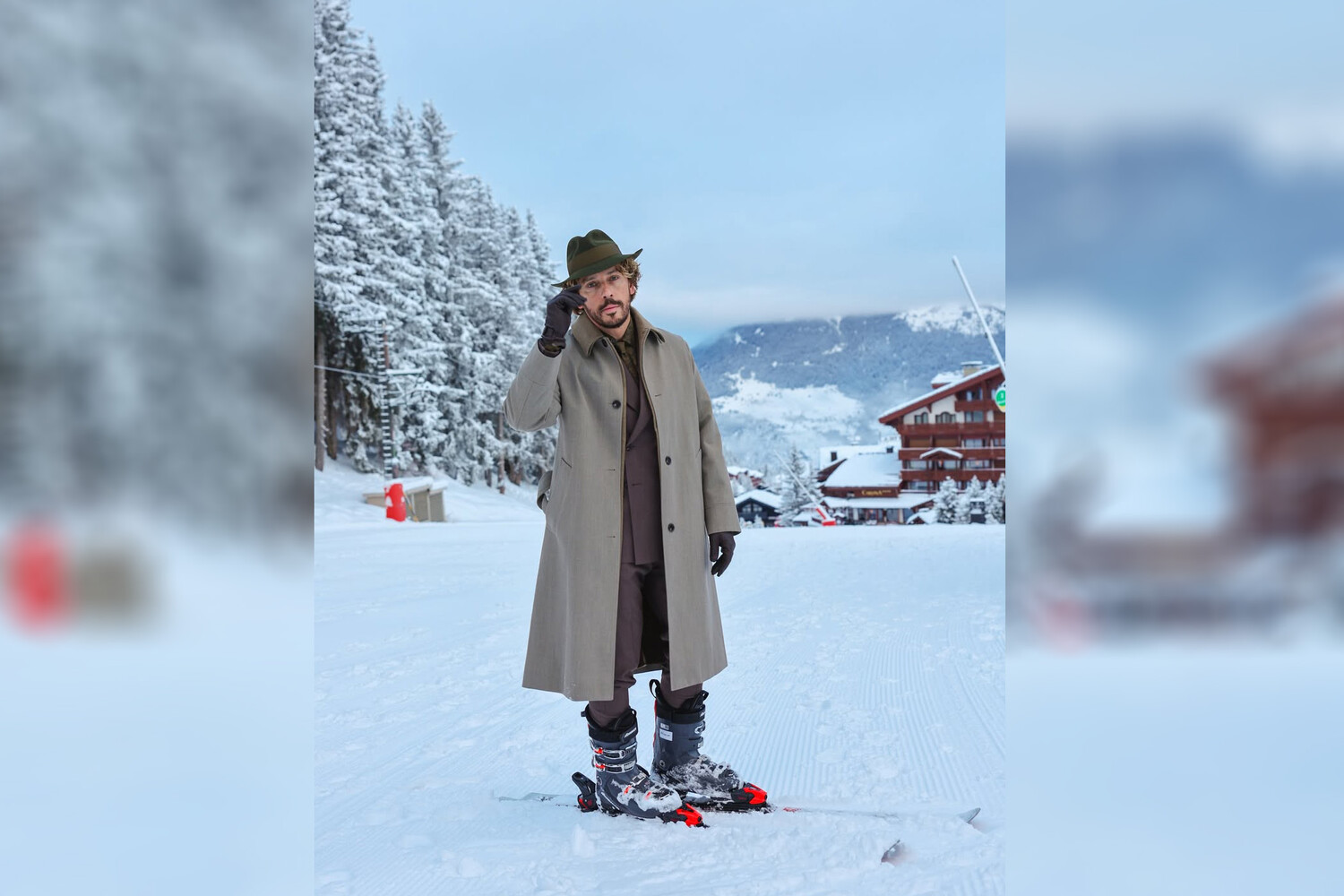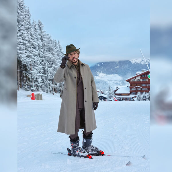 49-летний Максим Галкин стоял перед камерой в брючном костюме, рубашке с галстуком и пальто. Юморист дополнил образ шляпой и кожаными перчатками. Комик был запечатлен на лыжах на фоне горнолыжного курорта.