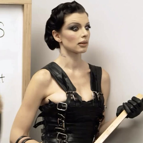 Джулия Фокс позировала в комбинезоне из черных кожаных ремней. Образ дополнила белая сумка с отделкой из кожи. Волосы ей уложили в низкий пучок и сделали вечерний макияж с угольно-черными стрелками и кремовой помадой.
