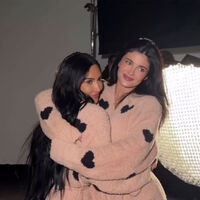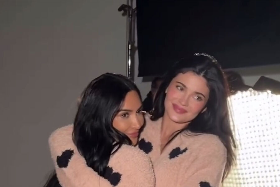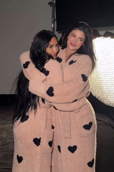 Ким Кардашьян и Кайли Дженнер позировали в одинаковых бежевых халатах с принтом в черный горох. Волосы сестрам уложили мягкими прядями и сделали легкий макияж. Они позировала перед съемкой для рекламы нового нижнего белья от бренда Ким Кардашьян.