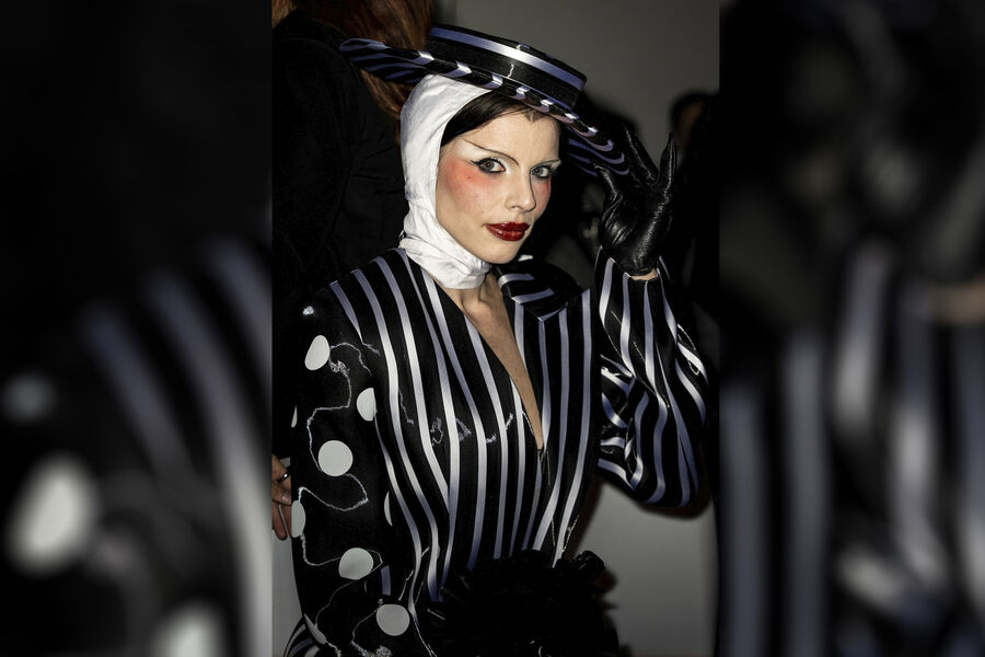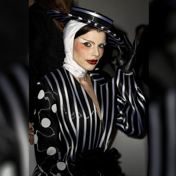 Джулия Фокс позировала в черно-белом жакете и мини-юбке. Образ дополнила шляпа и колготки в горох. Модели также сделали макияж со стрелками и белыми тенями.