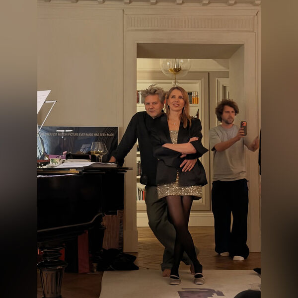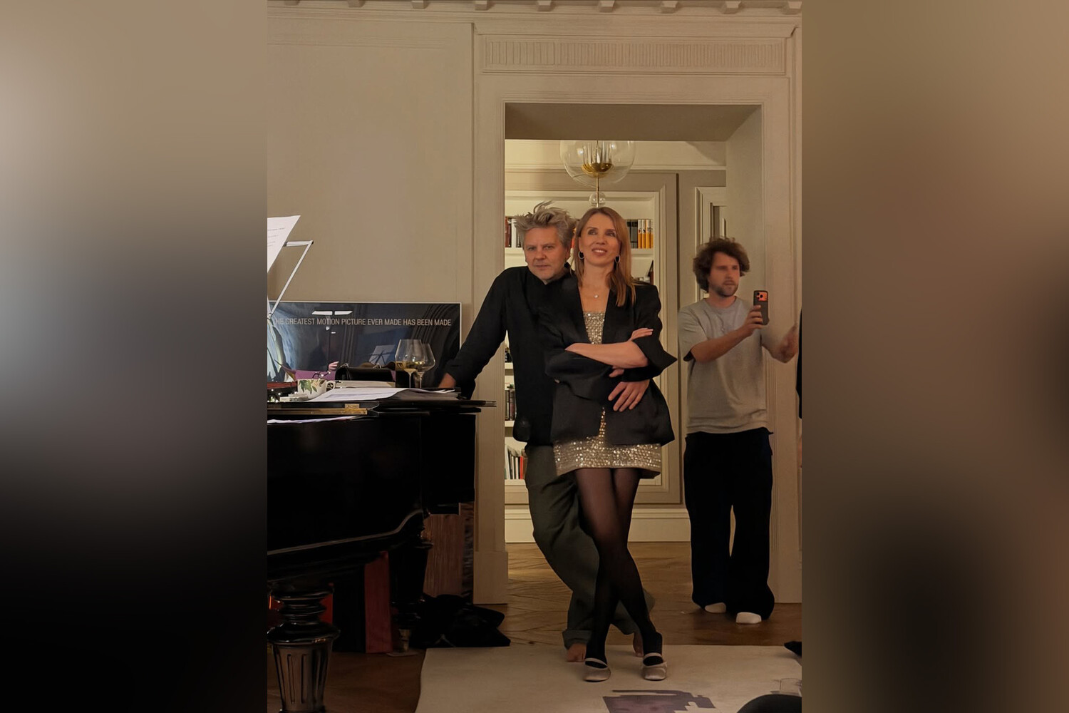 57-летняя Светлана Бондарчук была запечатлена в золотом мини-платье, которое было украшено пайетками. Телеведущая добавила к нему черный жакет, колготки, серьги-кольца и балетки. Модель позировала с уложенными распущенными волосами и макияжем. На одном из кадров знаменитость стояла с мужем Сергеем Харченко.