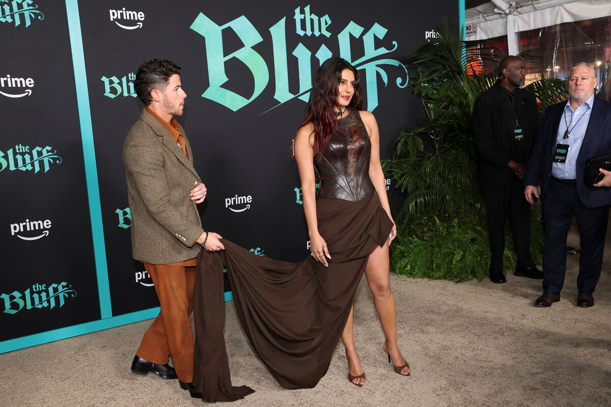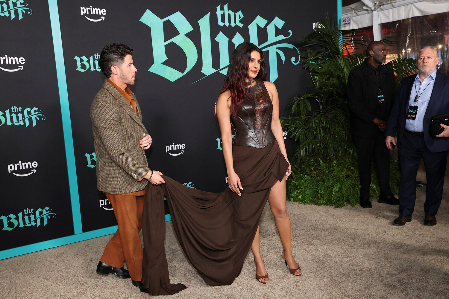 Приянка Чопра и Ник Джонас появились на премьере фильма «Блеф», которая состоялась 17 февраля в Голливуде. Актриса выбрала для закрытого мероприятия коричневое платье с кожаным корсетом и юбкой с разрезом до бедра и шлейфом. Артистка добавила к образу босоножки на каблуках, кольца и ожерелье. Ей уложили волосы в локоны и сделали макияж с розовыми румянами и помадой. Ник Джонас предпочел брючный костюм с рубашкой, шерстяной пиджак и черные туфли.