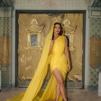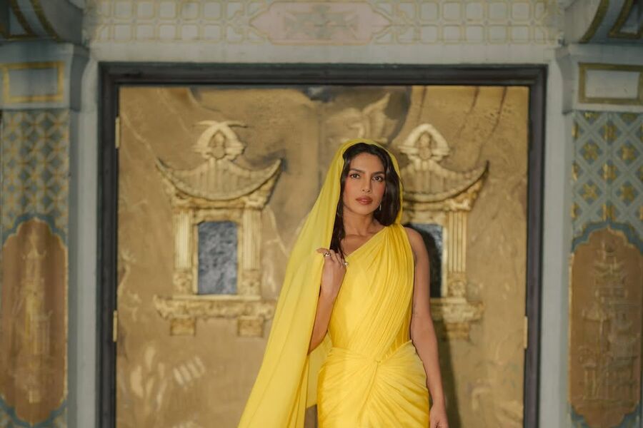 43-летняя Приянка Чопра позировала перед фотографом в желтом обтягивающем мини-платье с длинным шлейфом и золотых туфлях на каблуках. Актриса дополнила образ серьгами и кольцом. Знаменитости уложили распущенные волосы и сделали макияж с розовыми рунами и помадой.