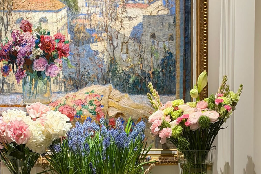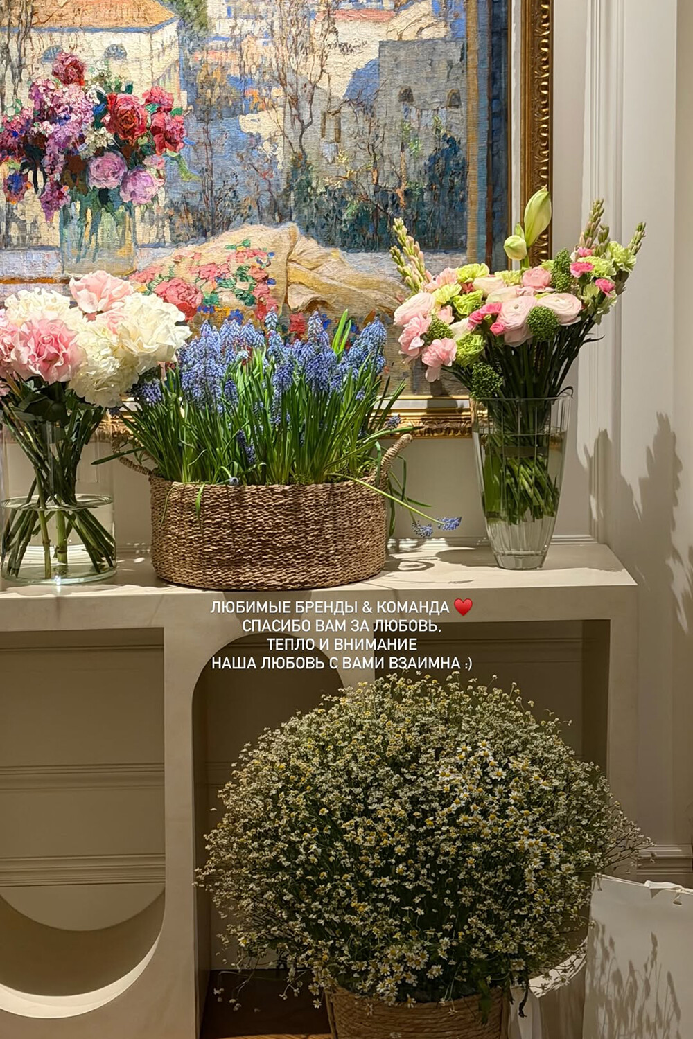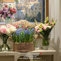 Стефания Маликова показала гостиную с картиной, на которой был изображен пейзаж. В кадр также попал журнальный стол, на котором стояли букеты цветов от партнеров и друзей бизнесвумен, подаренных в честь дня рождения.