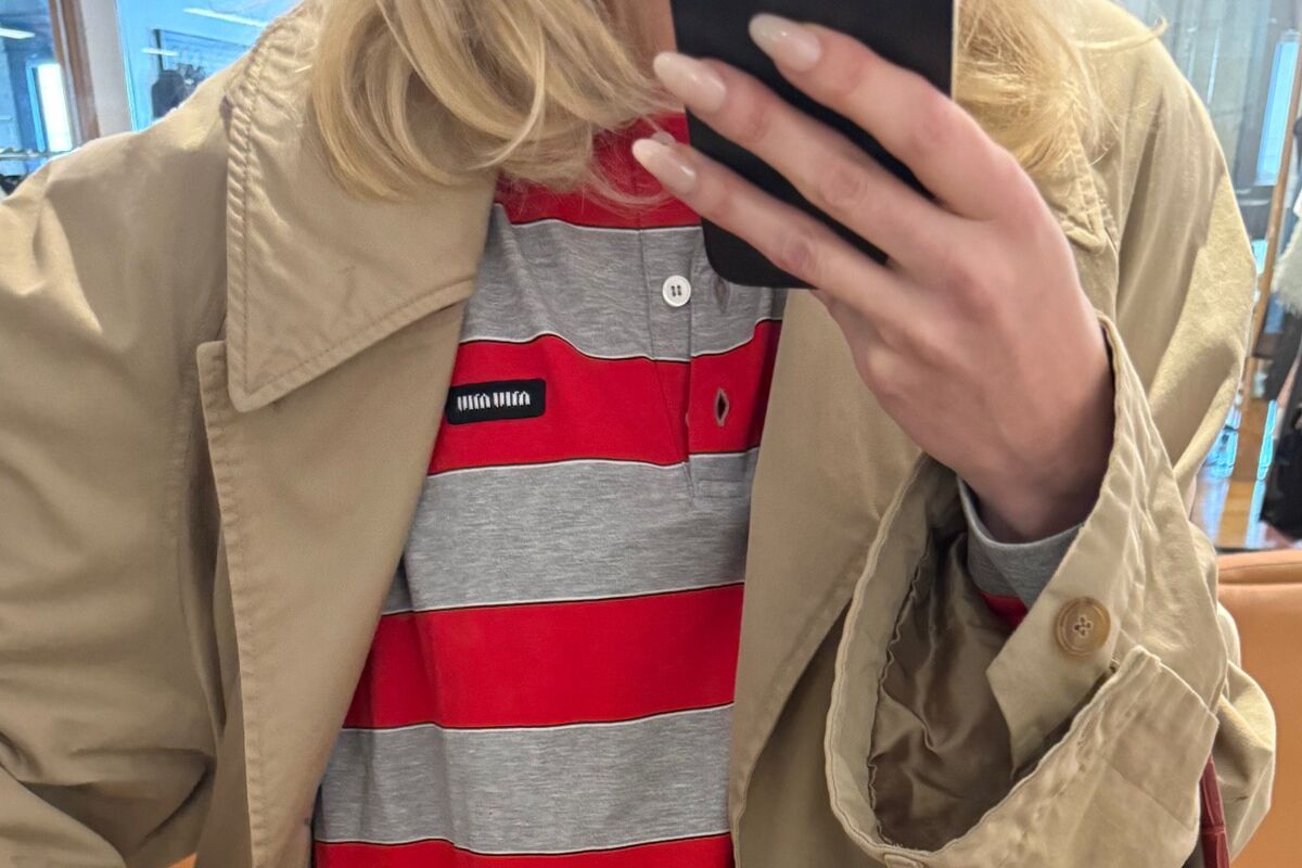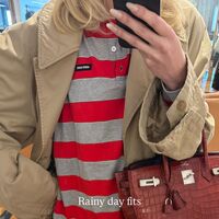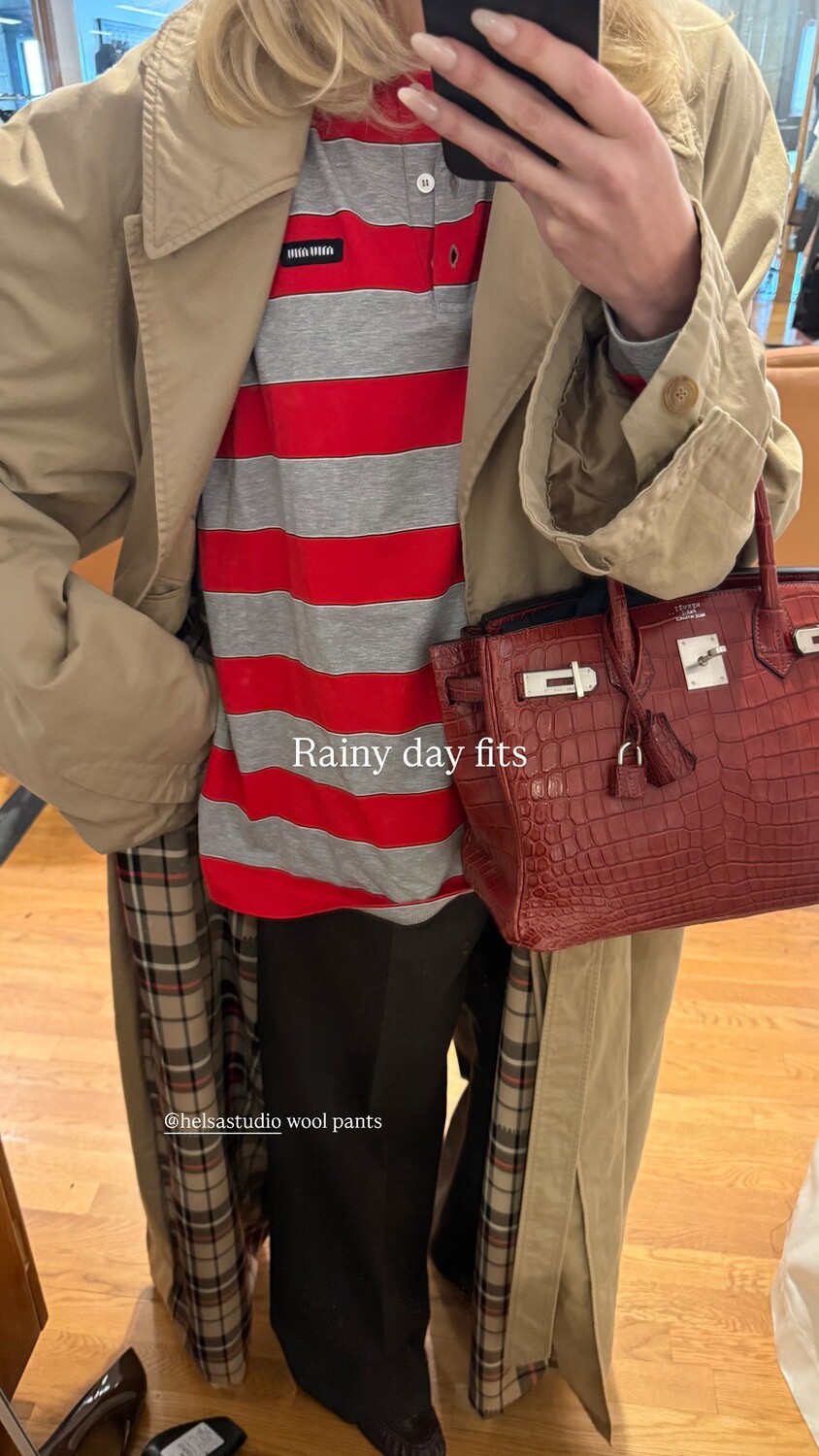 Эльза Хоск позировала в полосатом поло, черных брюках и бежевом тренче. Образ дополнила красная сумка Birkin из кожи под крокодила от бренда Hermes, стоимость которой составляет от 2-х миллионов рублей.
