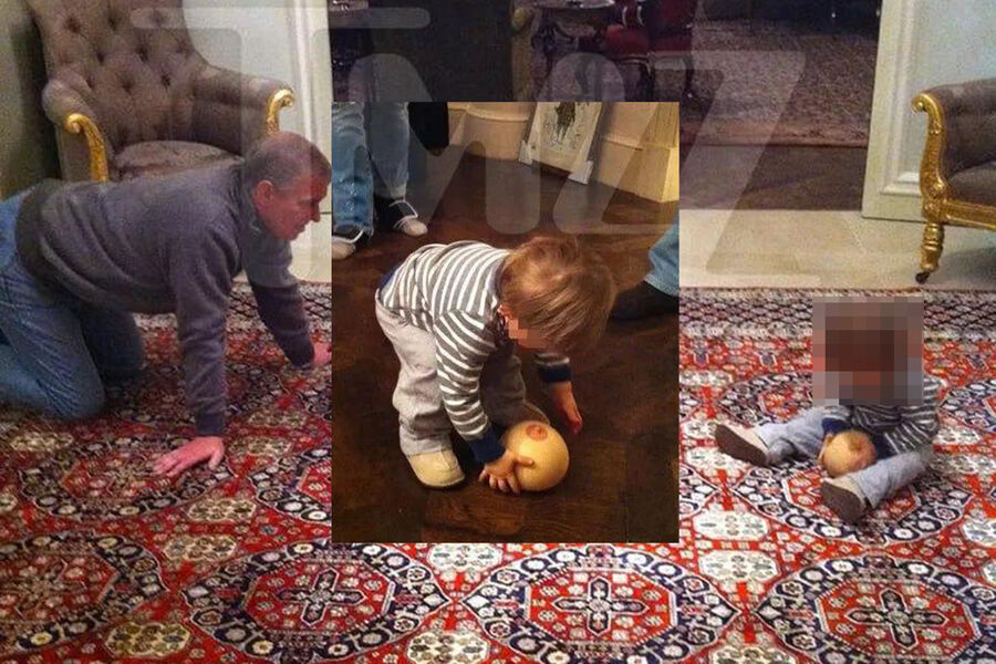 На обнародованных кадрах бывший принц стоит на четвереньках и перекатывает с ребенком мяч в форме женской груди. При этом игрушка имеет детализированное оформление, включая выступающий сосок.