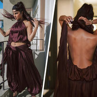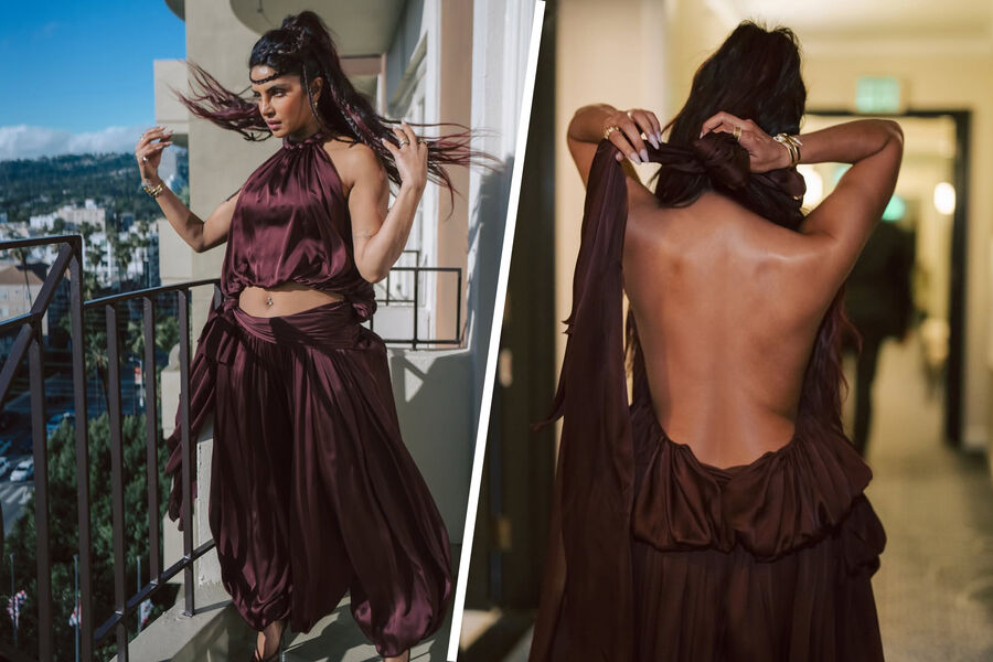 43-летняя Приянка Чопра предстала перед камерой в атласном фиолетовом комплекте, который состоял из топа с открытой спиной и шаровар. Актриса добавила к костюму лаковые туфли на каблуках, массивные браслеты, кольца и серьги. Знаменитости уложили волосы и сделали вечерний макияж.