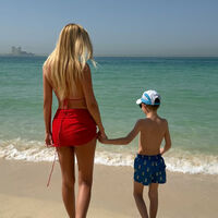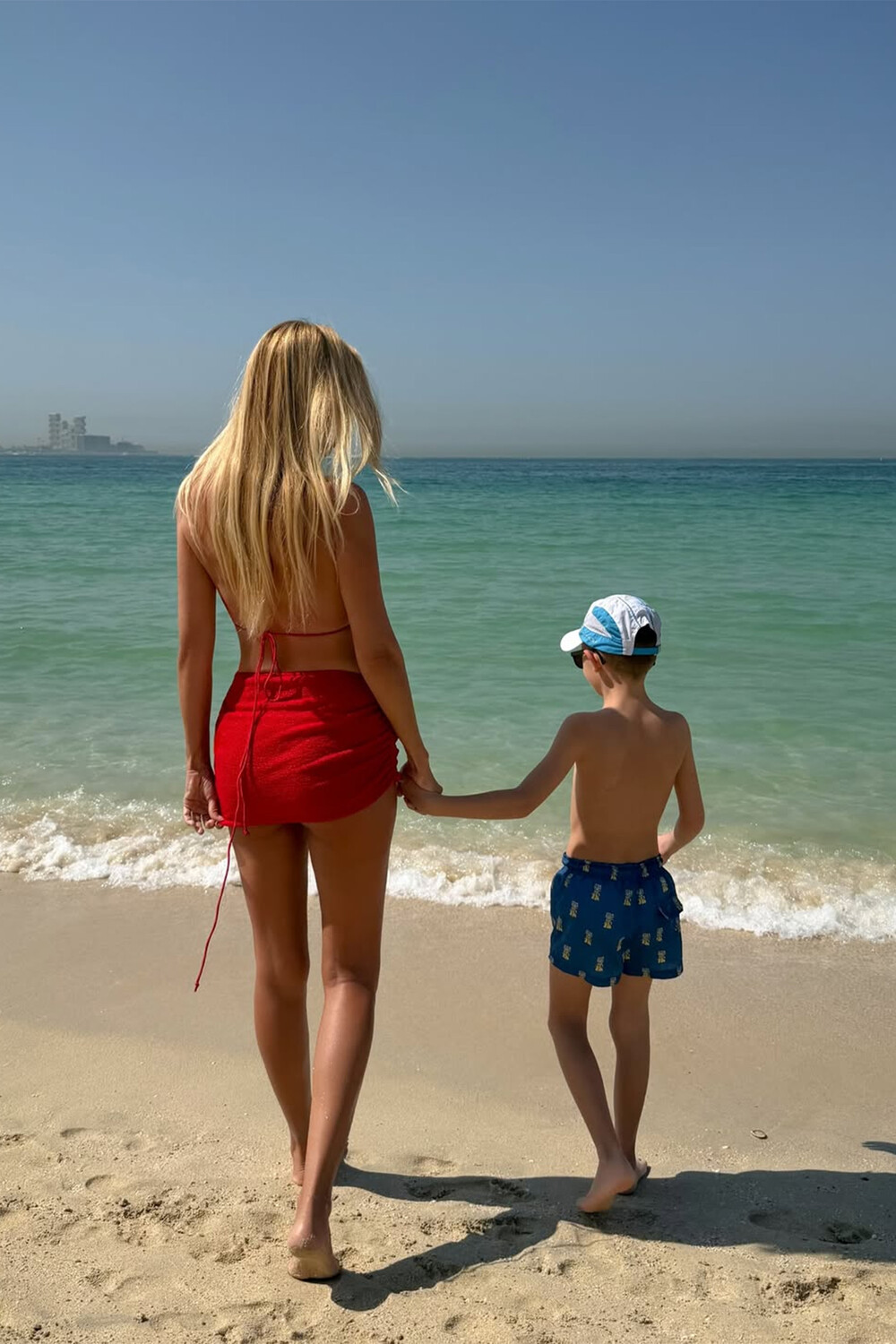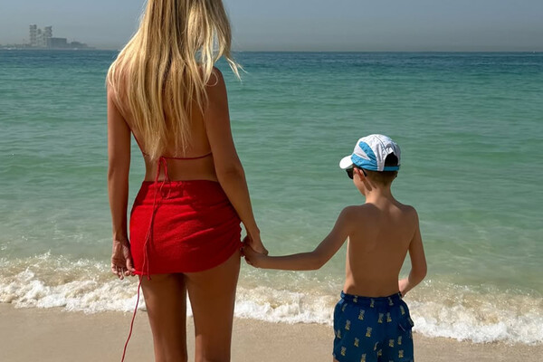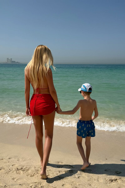 42-летняя Виктория Лопырева предстала перед камерой в красном лифе бикини, который дополнила мини-юбкой в тон. Модель позировала с распущенными волосами, стоя спиной к камере. Телеведущая была запечатлена вместе с сыном Марком Лионелем на пляже в Дубае.