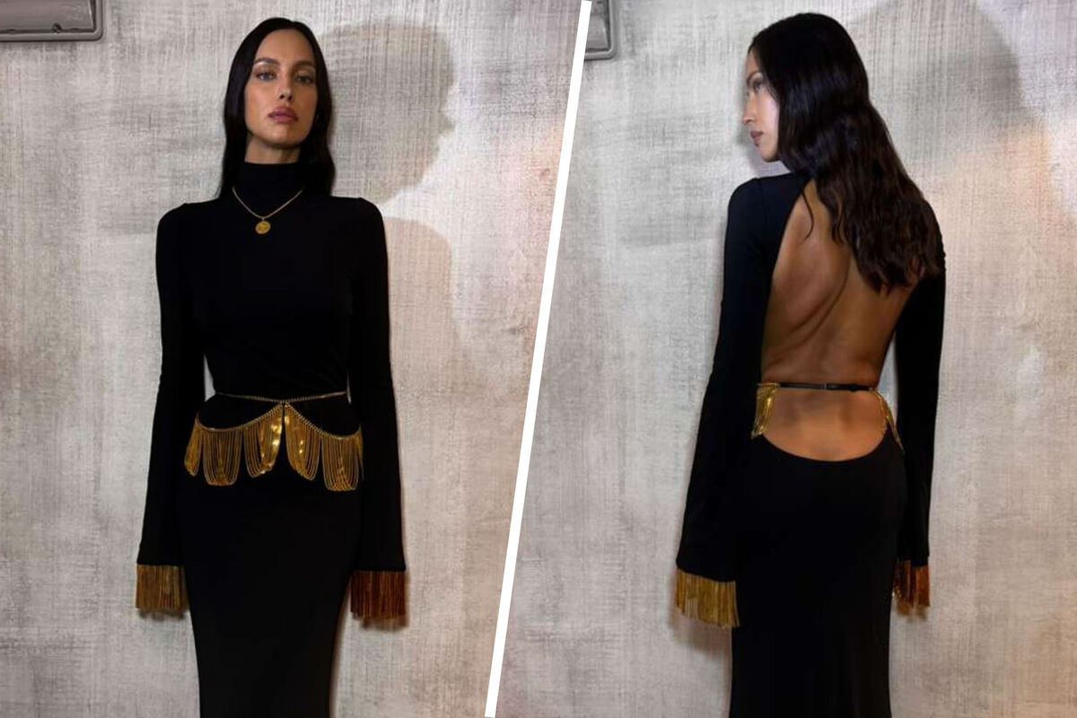 Ирина Шейк в платье с голой спиной и золотыми цепями вышла на сцену