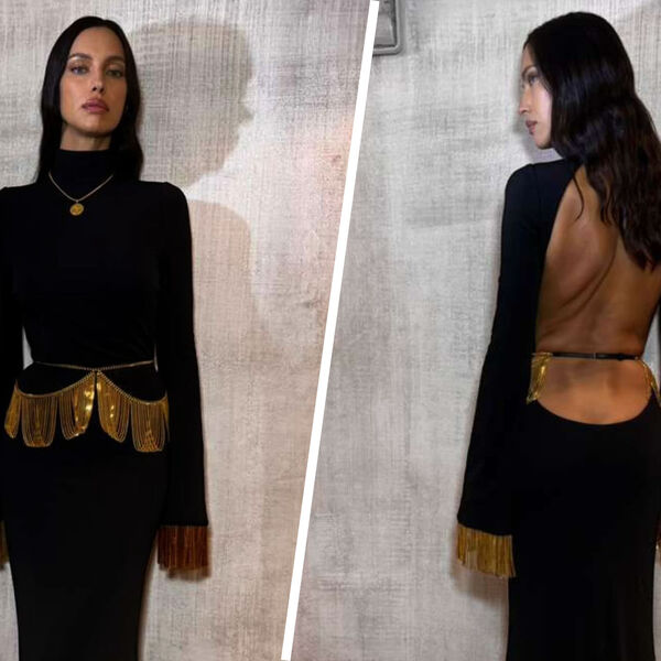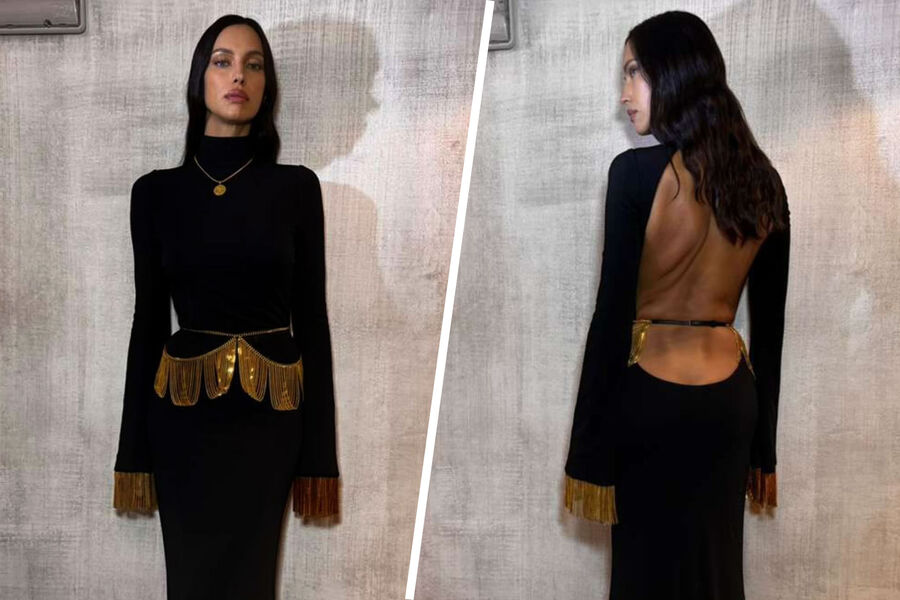 Ирина Шейк позировала в черном облегающем платье с голой спиной и поясом с золотыми цепями. Образ дополнил кулон с золотой монетой. Волосы ей уложили мягкими локонами и сделали макияж с блестящей темно-розовой помадой и угольно-черными стрелками.
