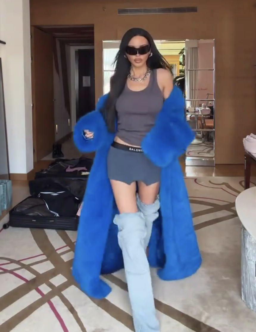 Оксана Самойлова предстала перед камерой в серой облегающей майке, юбке в виде мужских трусов, синей длинной шубе и джинсовых ботфортах на каблуках. Блогерша добавила к образу солнцезащитные очки, массивные серьги и цепи. Однако интернет-пользователи не оценили наряд знаменитости. Некоторые пошутили, что Оксана Самойлова забрала белье Джигана.