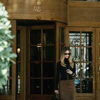 Рози Хантингтон-Уайтли вышла из отеля Ritz в Париже. Модель предпочла для показа в рамках Недели моды коричневую замшевую юбку-карандаш и черную водолазку. Образ дополнила золотая цепочка, черные туфли-лодочки и сучку из кожи. Волосы ей уложили мягкими прядями и сделали легкий макияж.