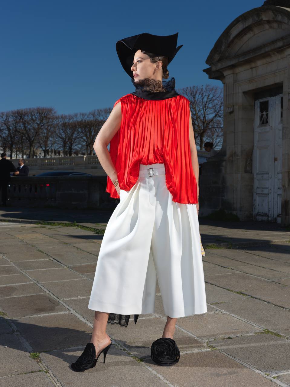 Ксения Собчак пришла на показ Dior в белых брюках-кюлотах, красной блузе с черной кружевной вуалью и голой спиной, шляпе и черных мюлях. Фотосессию она устроила на фоне жандармов.
