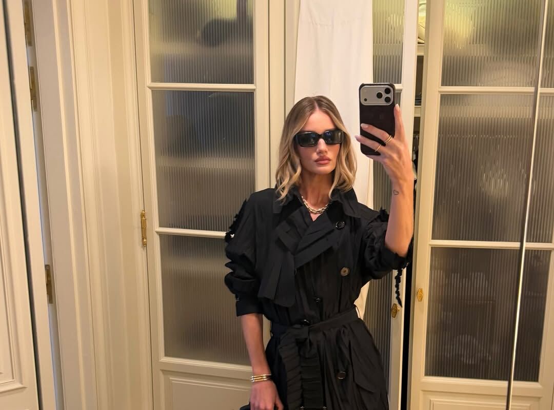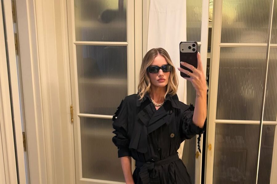Рози Хантингтон-Уайтли вышла на публику в черном тренче на голое тело, туфлях с открытым мысом и солнцезащитных очках. Образ дополнила сумка с золотой ручкой и украшения на шее. Волосы модель уложила мягкими локонами и сделала вечерний макияж с матовой помадой. В вечернем образе возлюбленна Стетхэма отправилась на вечеринку в Vogue Cafe.