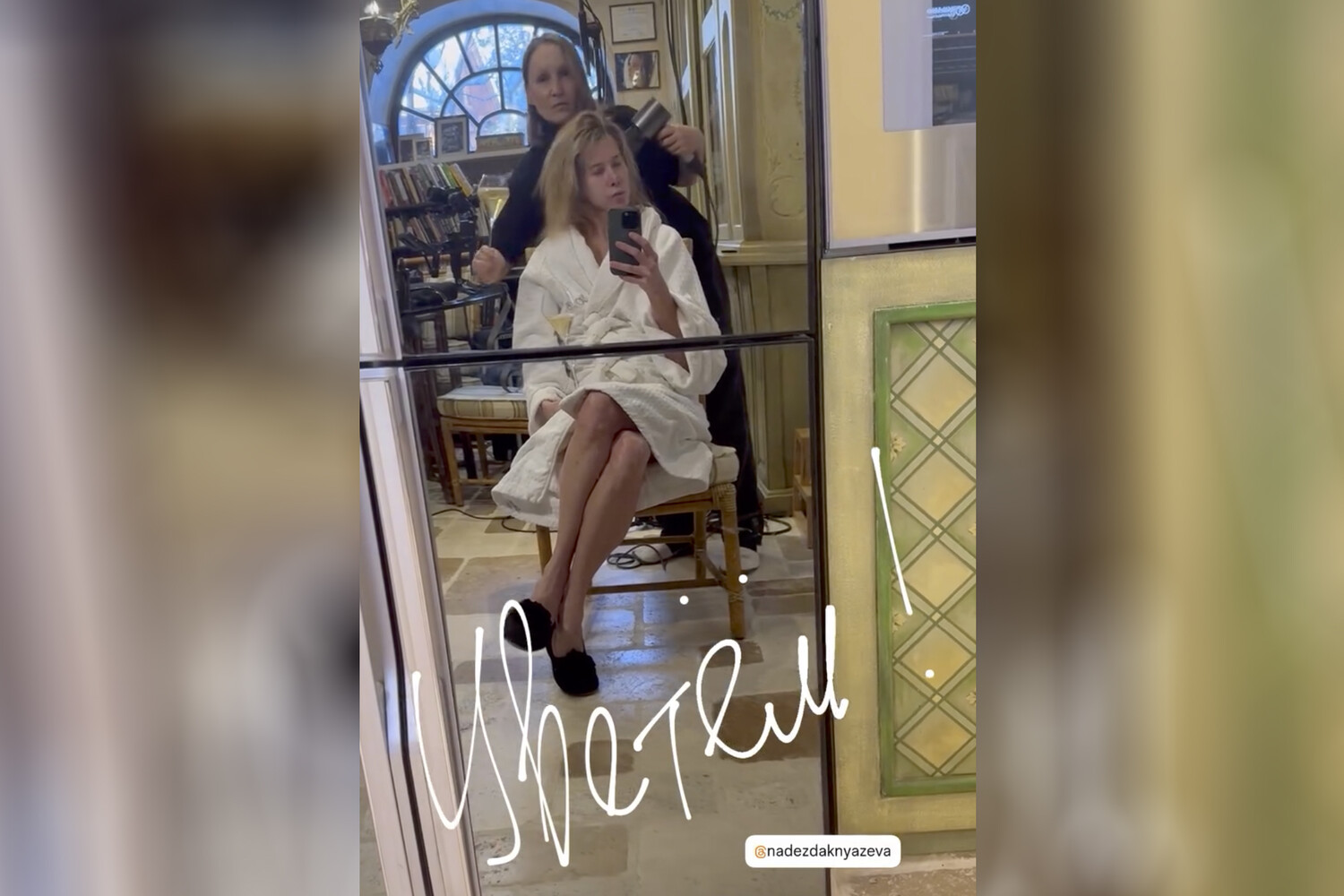 52-летняя Юлия Высоцкая сидела перед зеркалом в белом халате и черных тапках. Актриса позировала с распущенными волосами без укладки и без макияжа. Телеведущая была запечатлена с бокалом в руках во время укладки.