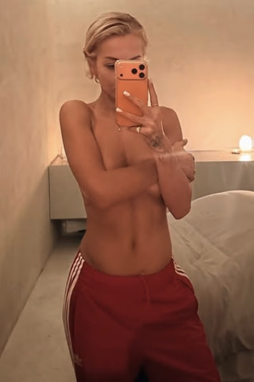 35-летняя Рита Ора снялась после массажа. Певица стояла перед зеркалом в красных спортивных штанах Adidas без топа и бюстгальтера. Поп-исполнительница также надела золотые кольца и цепочку. Знаменитость была запечатлена с распущенными волосами и без макияжа.